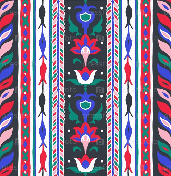 Геометрический дамасский орнамент. Икат границы. Этническая вышивка с листьями и монограммами. Племенная векторная текстура. Бесшовный народный узор в ацтекском стиле. Индийский, скандинавский, цыганский, мексиканский, африканский ковер