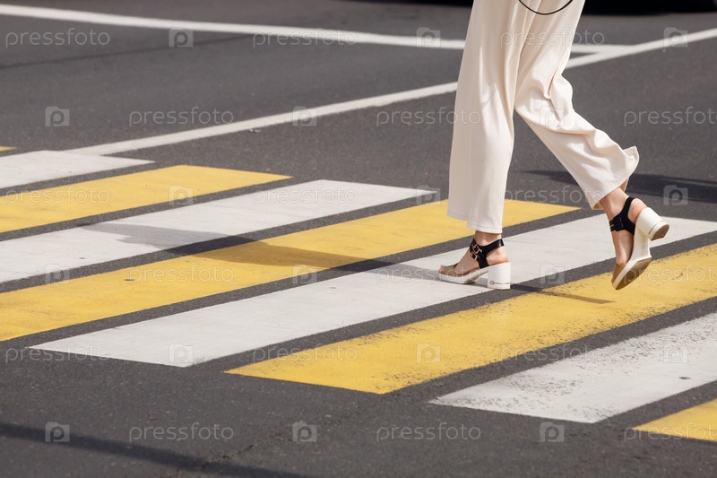 Люди переходят дорогу по пешеходному переходу. ноги крупным планом. на открытом воздухе в солнечный летний день