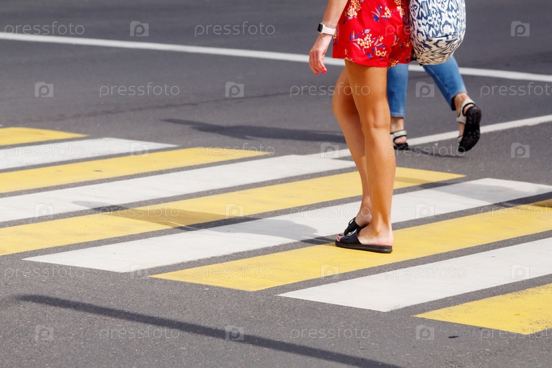 Люди переходят дорогу по пешеходному переходу. ноги крупным планом. на открытом воздухе в солнечный летний день