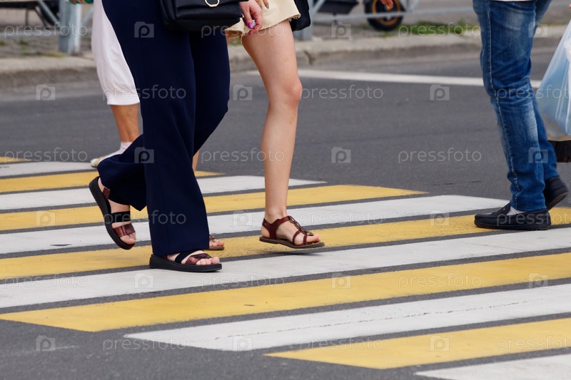 Люди переходят дорогу по пешеходному переходу. ноги крупным планом. на открытом воздухе в солнечный летний день