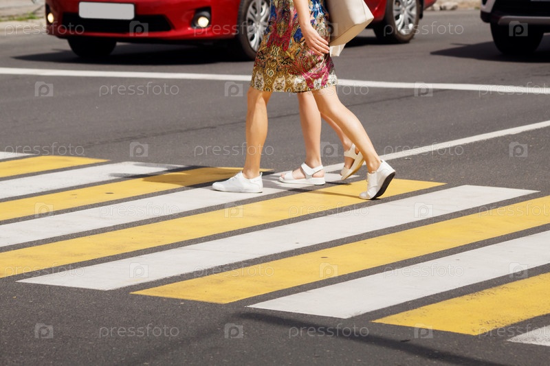 Люди переходят дорогу по пешеходному переходу. ноги крупным планом. на открытом воздухе в солнечный летний день