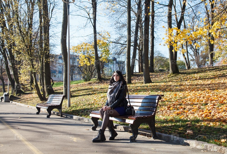 Молодая брюнетка в черной куртке и синем платье сидит на скамейке в городском парке в осенний день