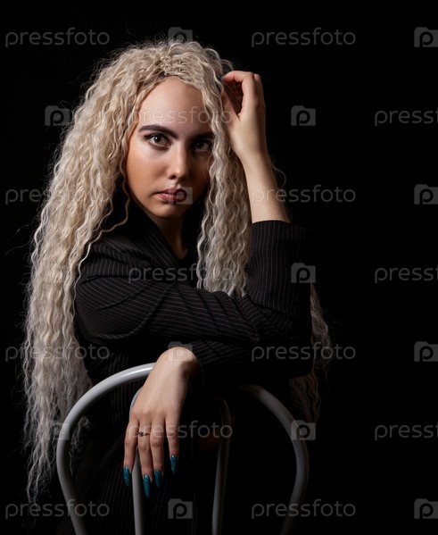Портрет молодой блондинки с длинными вьющимися волосами в студии на черном фоне