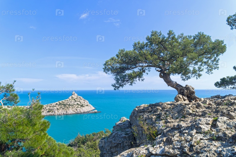 Реликт деревянного можжевельника (Juniperus excelsa). на скале над морем. Караул-Оба, Новый Свет, Крым