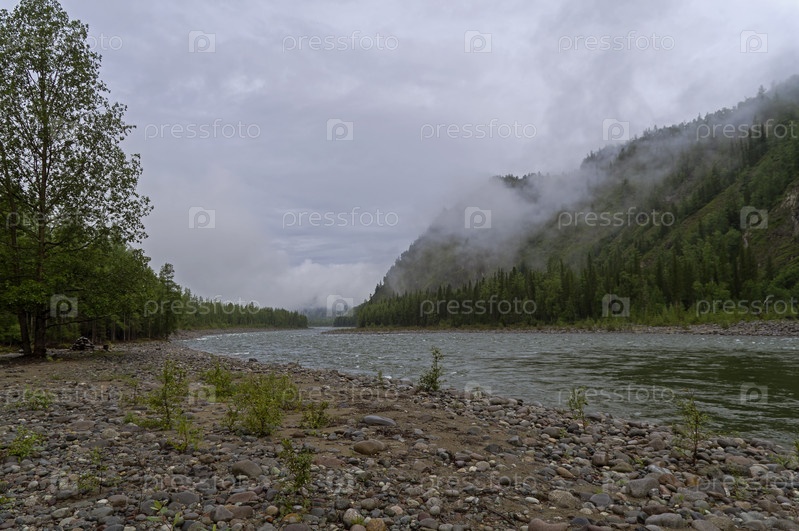 Низкие облака в горном ущелье над рекой. Река Ока Саянская, Сибирь, Россия. Пасмурный день в августе