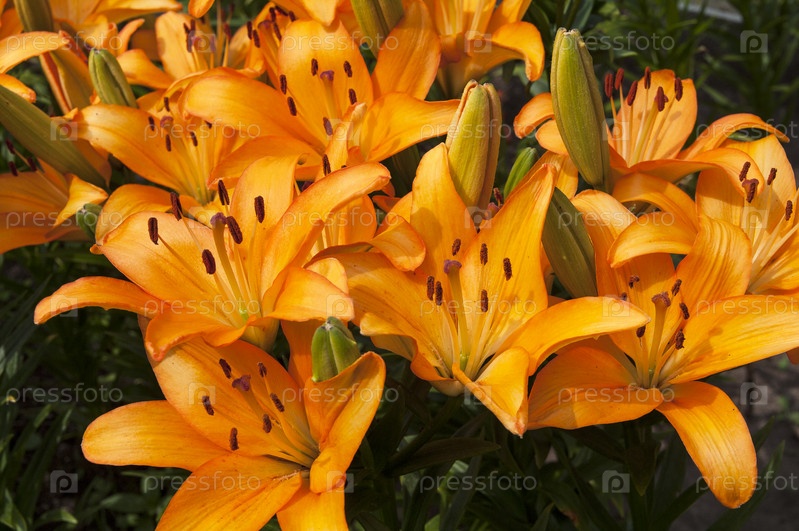 Красивые цветущие оранжевые лилии под ярким летним солнцем