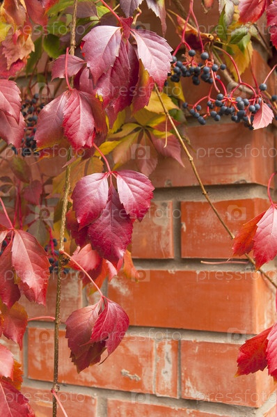 Покрасневшие листья девственного винограда (лат. Parthenocissus) на фоне кирпичной стены. осень, октябрь