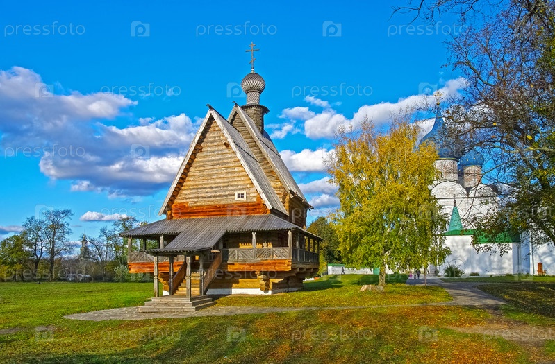 Деревянная церковь Николая Чудотворца из Глотово, перенесенная на территорию Суздальского кремля. Солнечный день в октябре