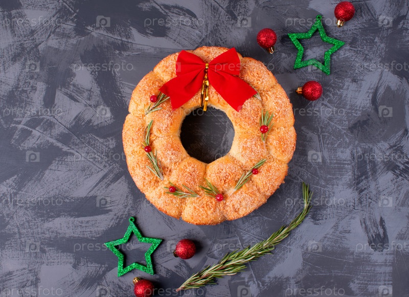 Хлебный рождественский венок с сыром, увенчанным розмарином и красными ягодами на сером столе. Праздничный обезьяний хлеб. Вид сверху