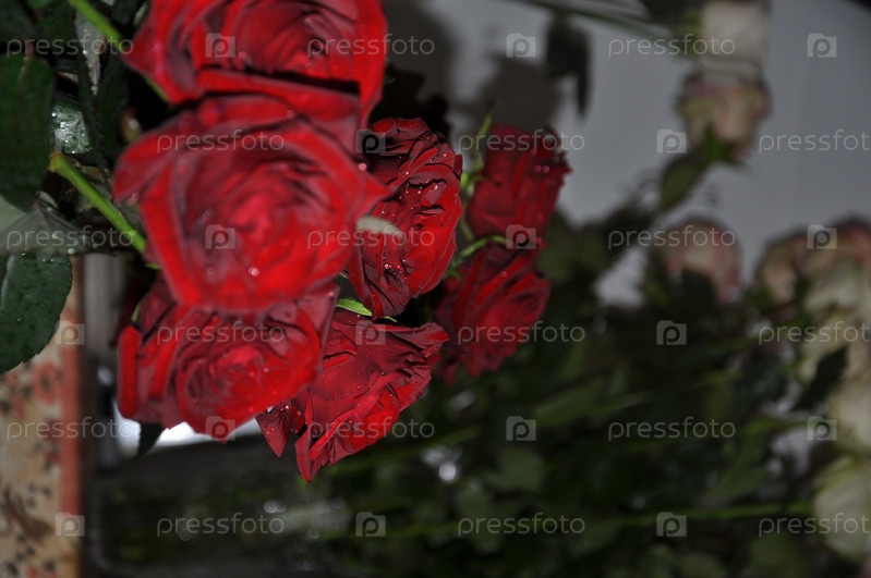 Красные розы. Букет. Розы крупным планом. Садовые цветы. Цветы и листья