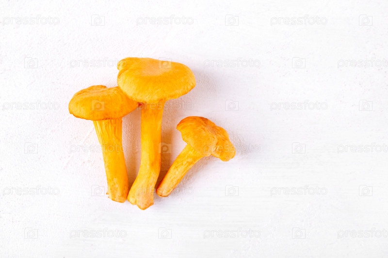 Три лисички на белом столе. Плоский лежал с ингредиентом. Копировать пространство