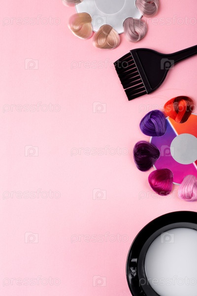 Профессиональный парикмахер плоская планировка. Образцы краски для волос разных цветов, кисть-аппликатор и краска в миске для смешивания оттенков на розовом фоне. Окрашивание волос в разные оттенки