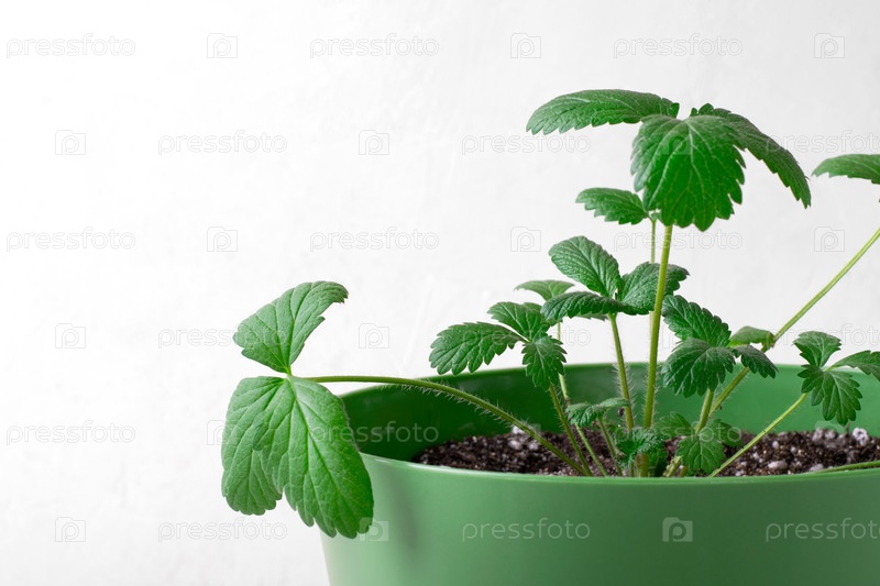 Клубничное растение в зеленом горшке на белом фоне. Выращивание ягод в домашних условиях. Балконный сорт
