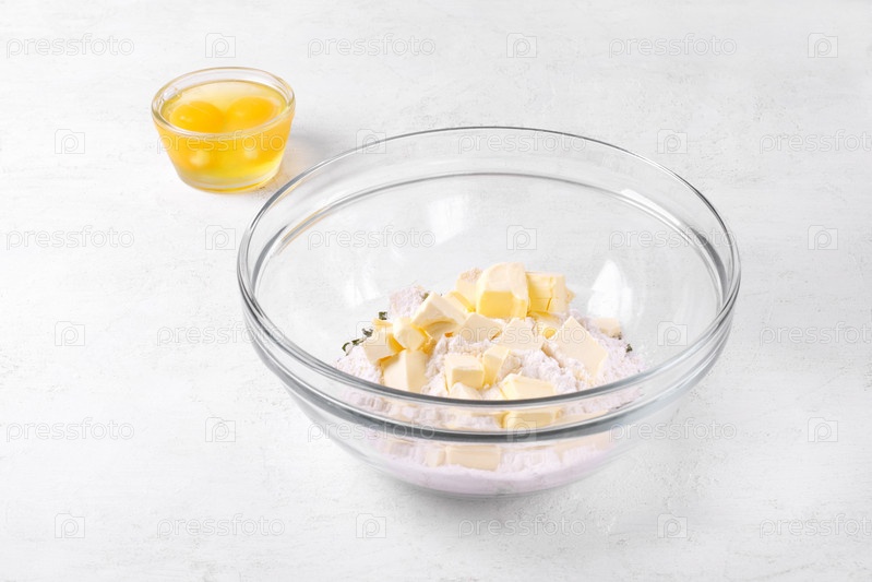 Приготовление песочного теста. Смешивание муки, соли, сушеных трав, масла и яиц в стеклянной миске на белом столе. Приготовление крекеров, пирогов, галет, пирогов или пирогов с заварным кремом