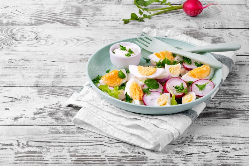 Салат с разноцветной редькой, вареными яйцами, рукколой и петрушкой подается со сметаной на зеленой тарелке