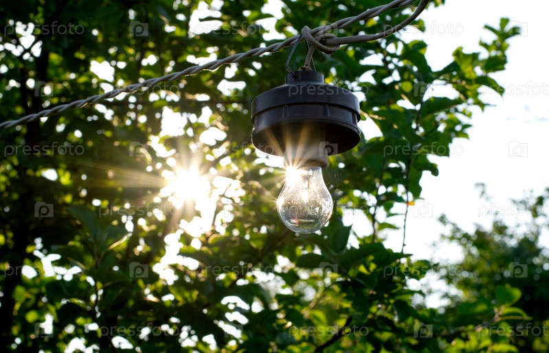 Лампочка с солнечными лучами, отражающимися в ней на открытом воздухе. Концепция солнечной энергии и зеленых инновационных технологий
