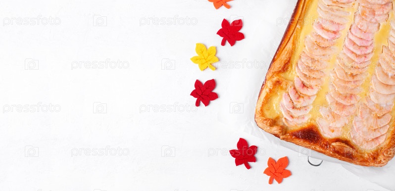 Веб-баннер с яблочным пирогом с заварным кремом на слоеном тесте на белом. Осенний десерт. Шаблон с копией пространства