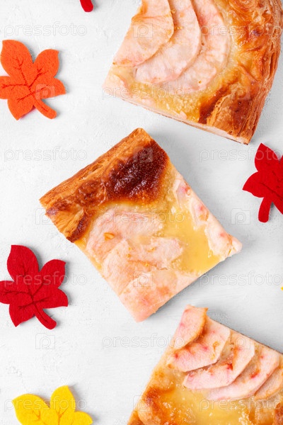 Кусочки яблочного пирога с заварным кремом на слоеном тесте на белом. Осенний десерт. Вид сверху