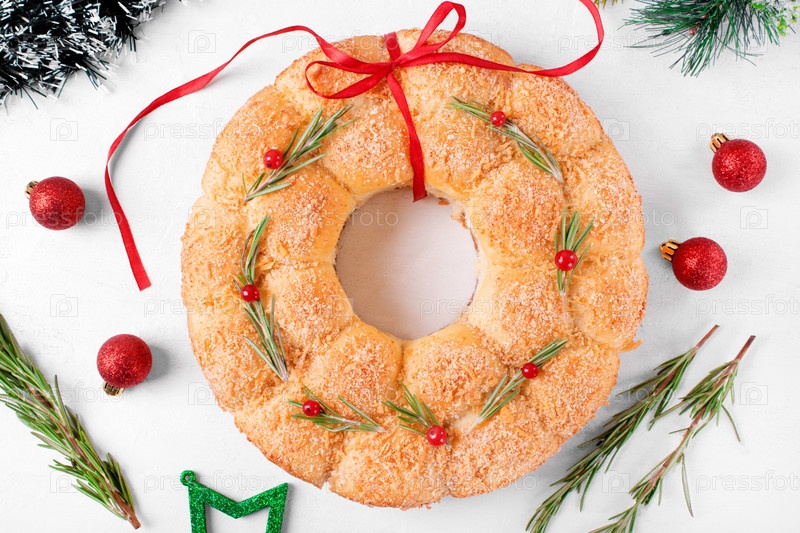 Хлебный рождественский венок с сыром, увенчанным розмарином и красными ягодами на белом столе. Праздничный обезьяний хлеб