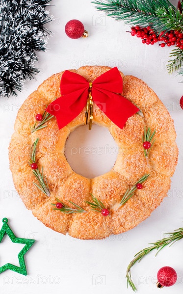 Хлебный рождественский венок с сыром, увенчанным розмарином и красными ягодами на белом столе. Праздничный обезьяний хлеб