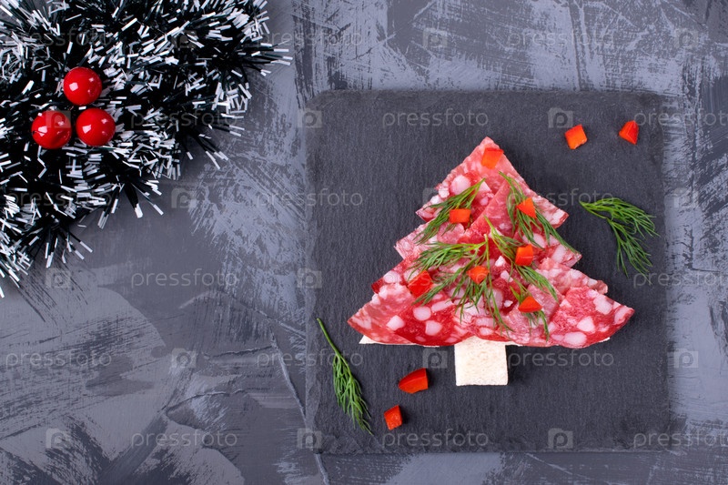 Канапе, рождественская елка, с салями на белом хлебе с укропом и перцем на сером столе. Вид сверху. Праздничная закуска. Сервировка новогоднего стола