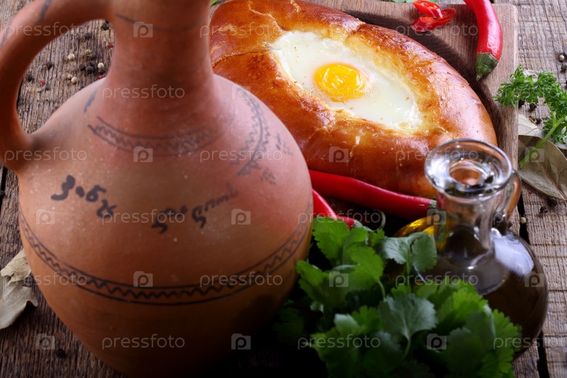 Аджарский хачапури, сырный пирог с кинзой, перцем и чесноком на деревянном столе