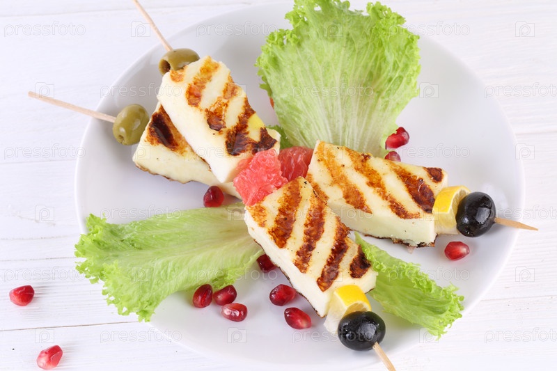 Жареный халлуми с лимоном и оливками на белом деревянном столе