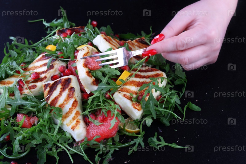 Женские руки режут жареный халуми на черном фоне