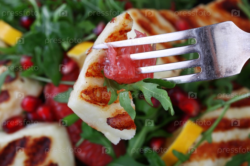 Халуми с гранатом и рукколой на черном фоне