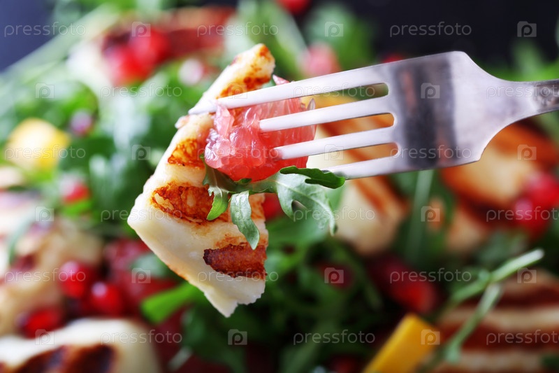 Халуми с гранатом и рукколой на черном фоне