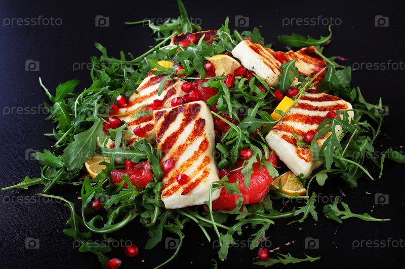 Халуми с гранатом и рукколой на черном фоне