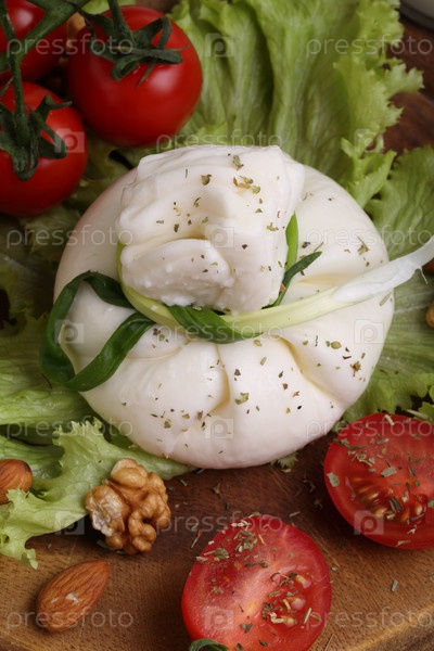 Буррата с помидорами и сливками на листьях салата