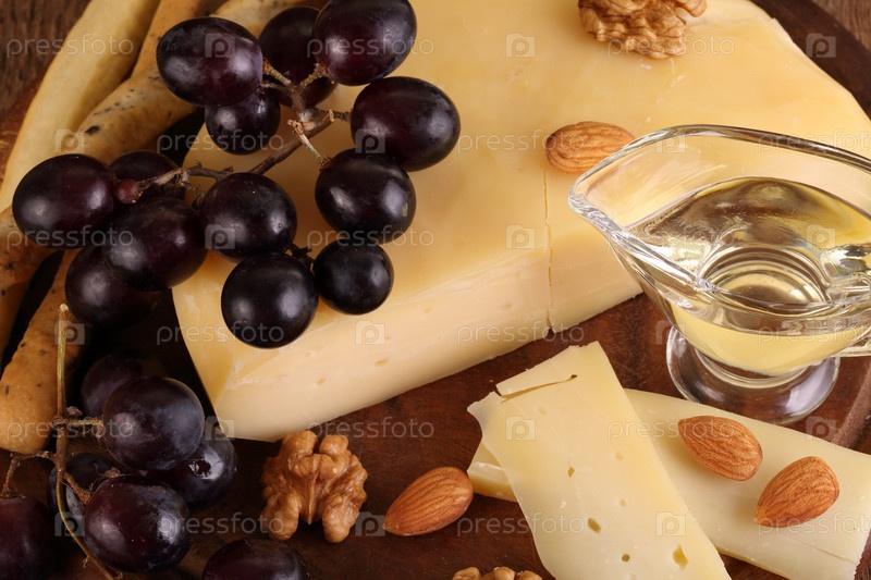 Сыр грюйер на деревянном столе с виноградом, орехами и оливковым маслом