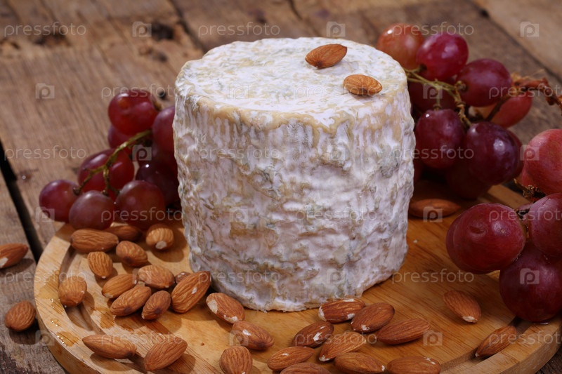 Горгонзола с миндалем и виноградом на деревянном столе