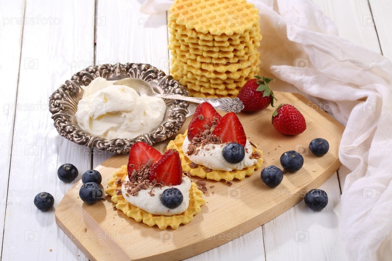 Сыр маскарпоне с клубникой и черникой на белом деревянном столе