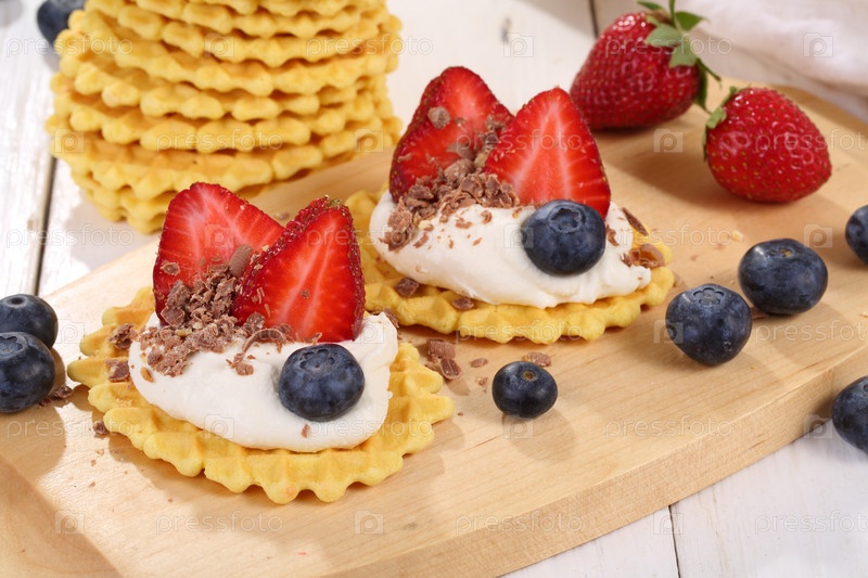 Сыр маскарпоне с клубникой и черникой на белом деревянном столе