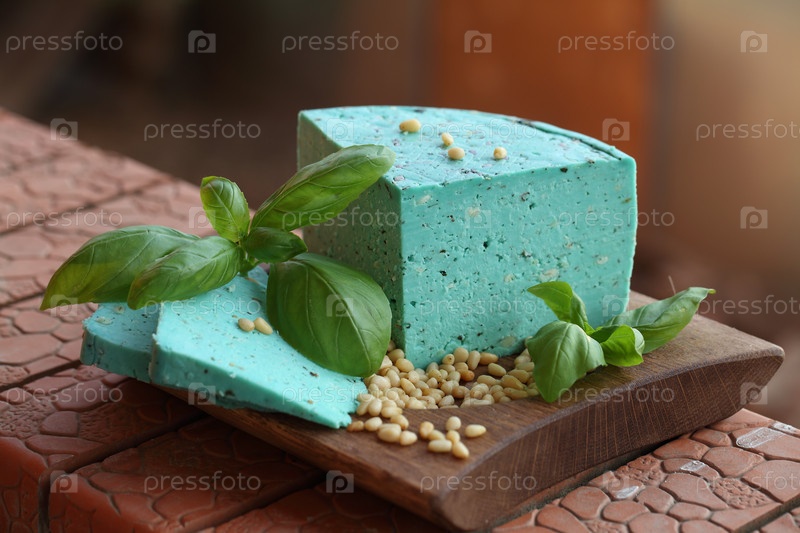 Сыр песто на деревянной тарелке с кедровыми орехами и базиликом