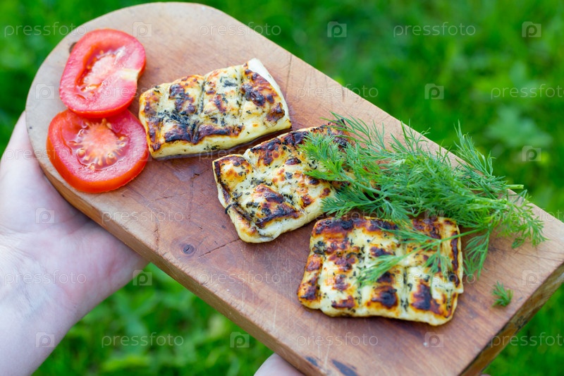 Халуми с помидорами и укропом на деревянной доске