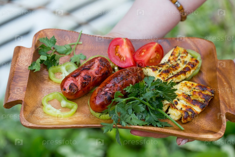 Халуми,сардельки поджаренные на гриле с помидорами и петрушкой на деревянном столе