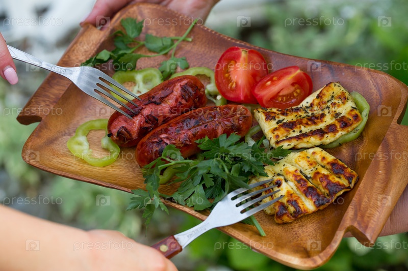 Халуми,сардельки поджаренные на гриле с помидорами и петрушкой на деревянном столе