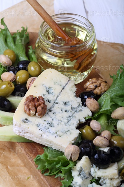 Голубой сыр с курагой и оливками на деревянном столе