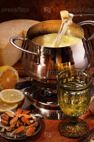 Фондю с сыром, крекерами и морепродуктами
