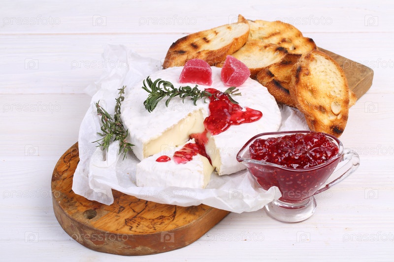Камамбер с багетом на гриле, малиновым джемом и вином