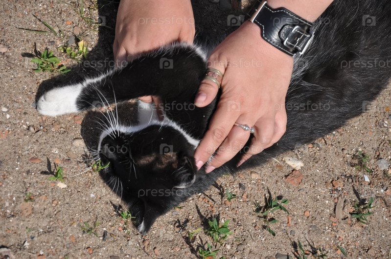 Черный кот. Девушка гладит кошку. Лежащий котенок. Кошка крупным планом