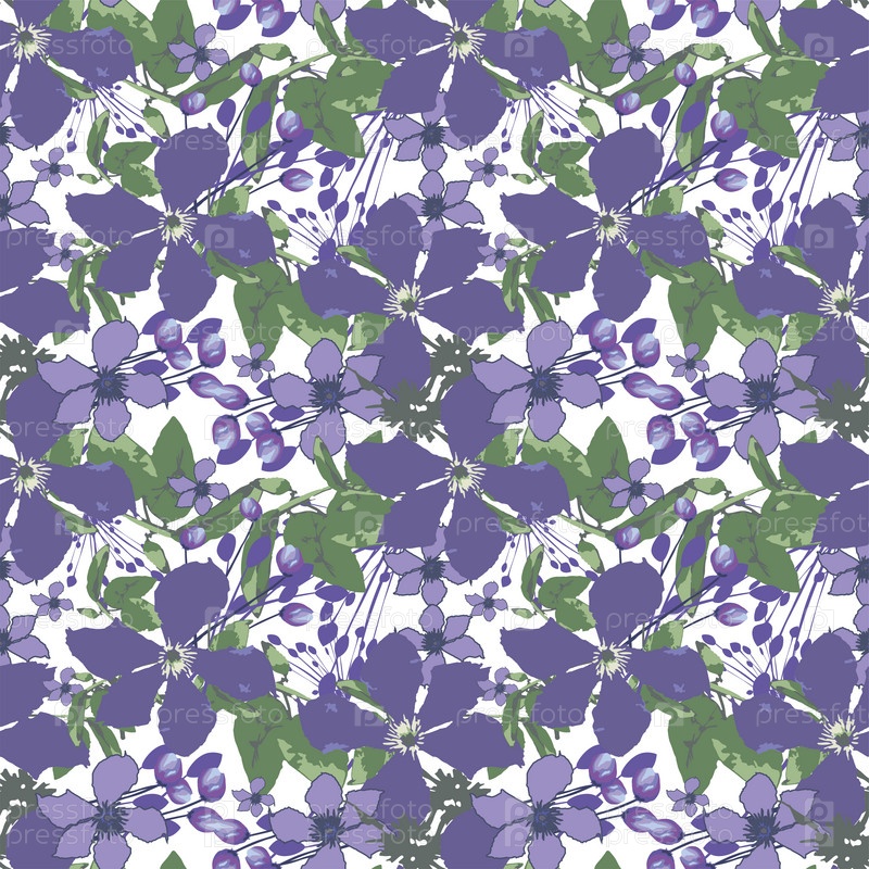 Бесшовный узор вектор с цветами. Фиолетовые цветы с листьями. Молодые цветы и бутоны
