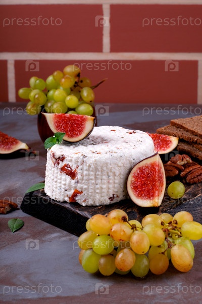 Свежий домашний сыр с вялеными помидорами, пажитником и травами подается на деревянной доске с инжиром, виноградом, орехами пекан и хрустящими хлебцами