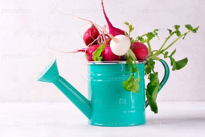 Пучок разнообразной редьки в маленькой зеленой лейке на белом столе. Летний урожай. Сельскохозяйственный состав