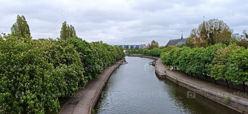 Цветущие каштаны по берегам реки Преголя. Калининград, май 2022