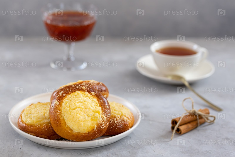 Чизкейк со штрейзелем на бетонном фоне, чаепитие с пирогами и джемом