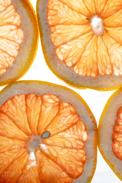 Ломтики лимона и грейпфрута на белом фоне на просвет
